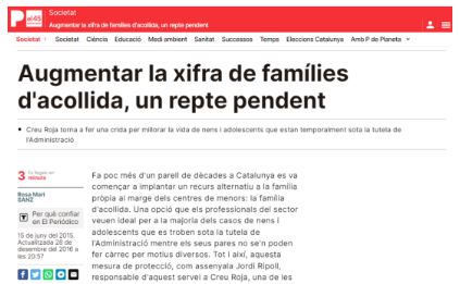 2015 - El Periódico. Augmentar la xifra de famílies d’acollida, un repte pendent
