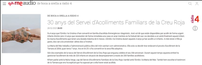 2023 - Programa De Boca a Orella de Ràdio 4 (RTVE). 30 anys del Servei d'Acolliments Familiars de la Creu Roja: