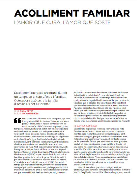 Article que parla de tots els col·lectius amb els que treballa la Creu Roja i en el qual hi ha un petit apartat dedicat a l'acolliment familiar que relata l'experiència d'una persona que va decidir ser família d'acollida.