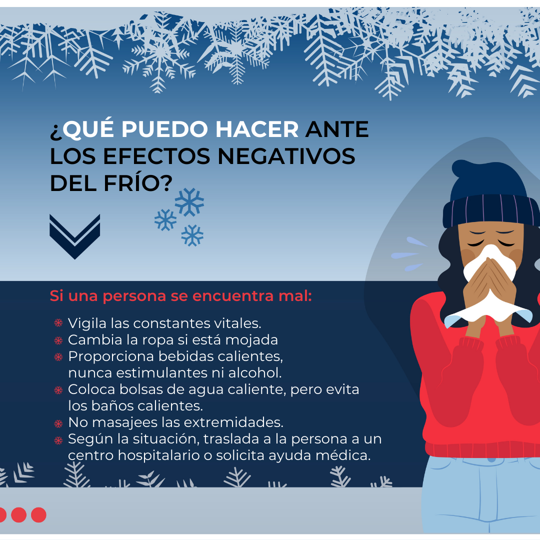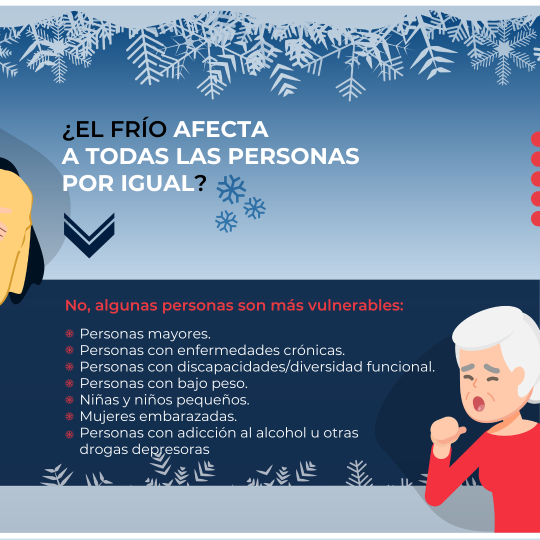 Las olas de frío y de calor son especialmente sufridas por las personas más vulnerables, sin embargo, las de frío causan mayor mortalidad al disminuir defensas y favorecer las enfermedades respiratorias. Con la bajada de temperaturas, las personas indomiciliadas sufren acusadamente las consecuencias. Para paliar todos los efectos que provoca en ellos y ellas esta situación, Cruz Roja cuenta con las Unidades de Emergencia Social (UES), que atienen a las personas sin hogar, además de los Equipos de Respuesta Inmediata en Emergencias (ERIE) y Equipos de Respuesta Básica en Emergencia (ERBE) preparados para atender a las personas que se vean afectadas por cualquier incidencia meteorológica.