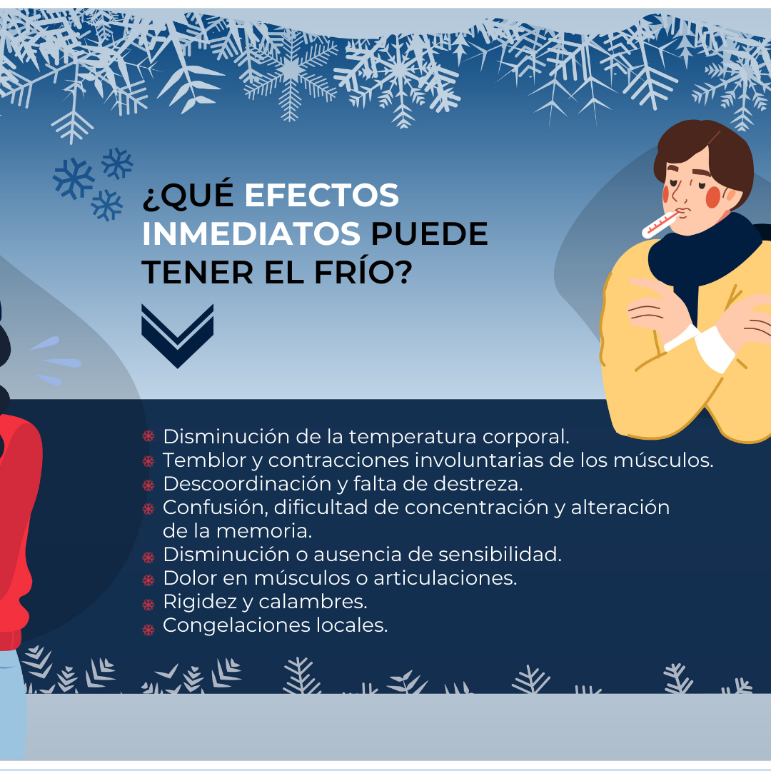 Si tienes que hacer actividades en el exterior durante las horas de más frío (una vez oscurecido) no olvides abrigarte, sobre todo las extremidades, usando gorro, guantes, etc. y evitar la entrada de aire frío en los pulmones. No uses prendas apretadas o mojadas, bebe líquidos calientes y azucarados, no tomes bebidas alcohólicas y permanece en movimiento.