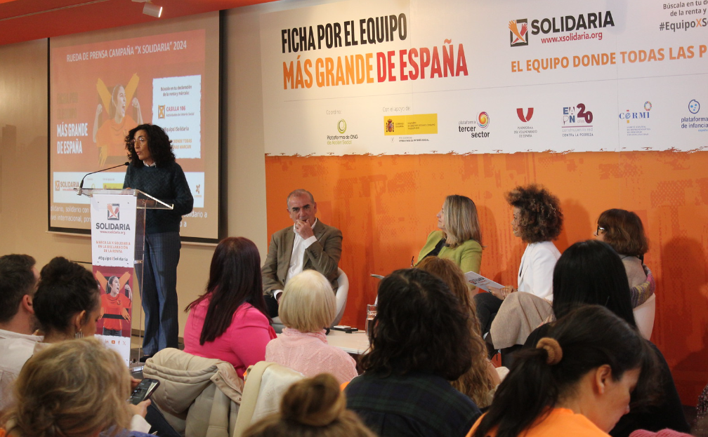 A su intervención le ha seguido Yolanda Besteiro, presidenta de la Plataforma de ONG de Acción Social, entidad que coordina la campaña, quien ha añadido que la “X Solidaria” es “una campaña que aúna los esfuerzos de las entidades del Consejo Estatal de ONG de Acción Social, junto a los de la administración y el apoyo de la sociedad, para repercutir de manera muy positiva en la vida de millones de personas y hacer posible que no se deje a nadie atrás”. Es por esto que ha resaltado la importancia de que su mensaje llegue a todo el mundo, ya que, aunque ha destacado que en 2023 “gracias a los más de 12 millones de personas que han marcado la casilla de Fines Sociales en su renta se han recaudado más de 475 millones de euros, todavía hay un 47% de la población que no la marca, seguramente porque desconocen que no les cuesta nada: ni pagan más ni les devuelven menos”.