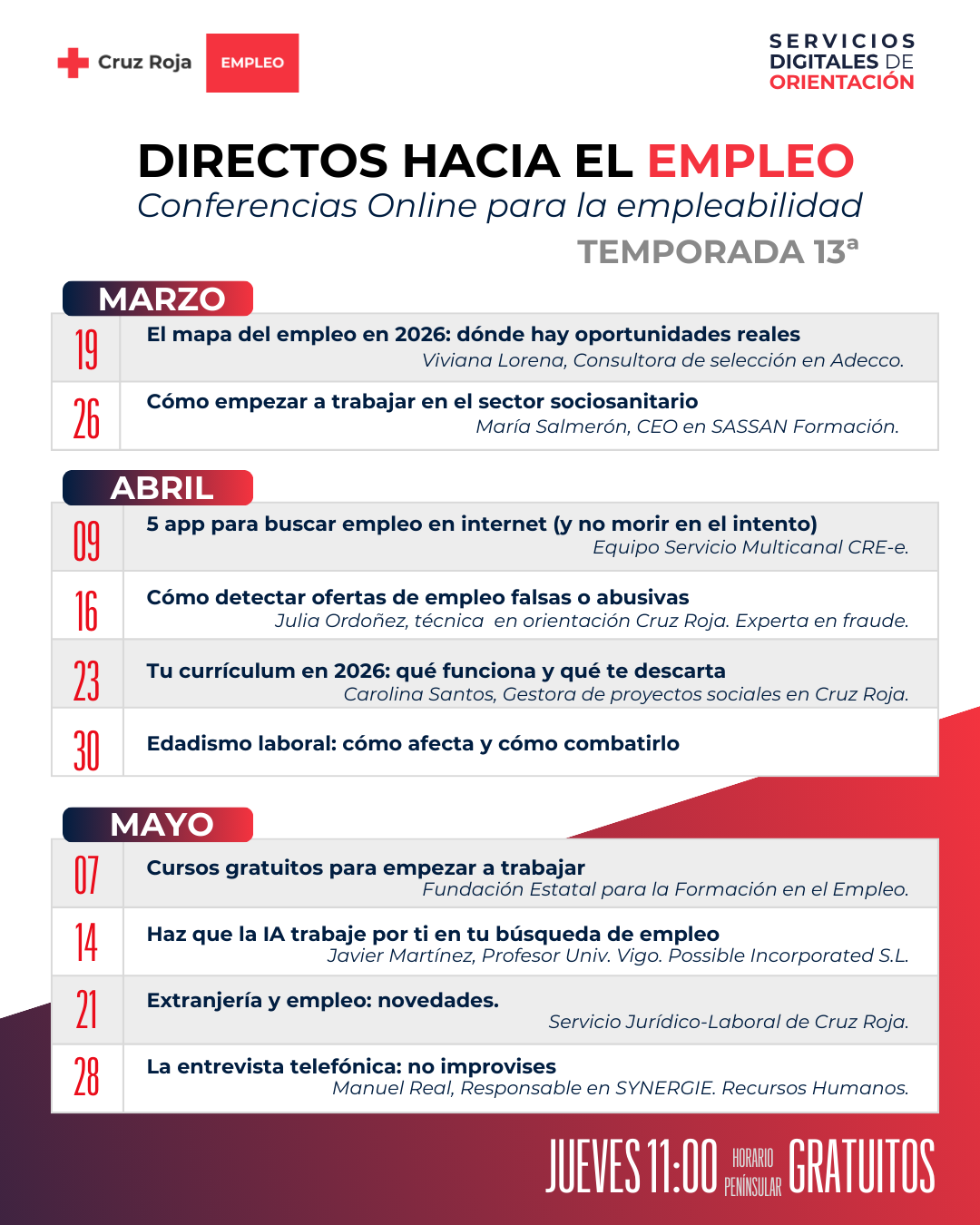 También dedicaremos varias sesiones a temas que preocupan cada vez más a las personas en búsqueda de empleo, como cómo detectar ofertas de trabajo falsas o abusivas, cómo adaptar el currículum a los procesos de selección actuales, o cómo aprovechar la inteligencia artificial para mejorar la búsqueda de empleo.