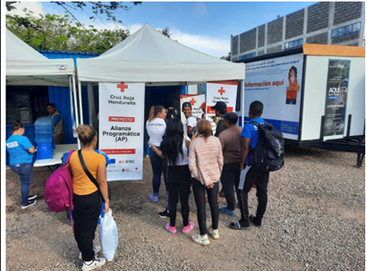 Como se mencionaba al inicio, uno de los principales retos que enfrenta Honduras es la crisis de movilidad humana que afecta a toda la región. El proyecto ha promovido la asistencia humanitaria y protección para las personas desplazadas y migrantes en tránsito, así como a población local de comunidades de acogida en situación de vulnerabilidad, incluyendo la gestión (atención primaria y derivación) de casos críticos de salud. Las capacitaciones en Primeros Auxilios y Soporte Vital Básico a voluntarios y técnicos del Cruz Roja Hondureña que trabajan en los puntos de asistencia humanitarios permite alcanzar a los migrantes en la zona. Se pone además especial énfasis en la identificación de niñas y niños y mujeres embarazadas y lactantes con la finalidad de monitorear su estado nutricional.