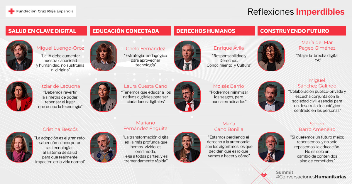 “Hay una máxima que siempre acompaña los principios humanitarios sobre los que se articula la actividad de Cruz Roja, y esa es: No hacer daño. No dañar. La tecnología ofrece múltiples oportunidades para construir un futuro más justo, inclusivo y capaz de socializar entre todas las personas los innumerables beneficios de nuestras sociedades. Pero a la vez, el desarrollo tecnológico lleva aparejada la existencia de riesgos que pueden conducirnos en la dirección opuesta. Para que no sea así, para que la tecnología no haga daño y conserve su potencial de beneficio humanitario hay dos elementos que resultan claves: la ética y el sentido crítico.”